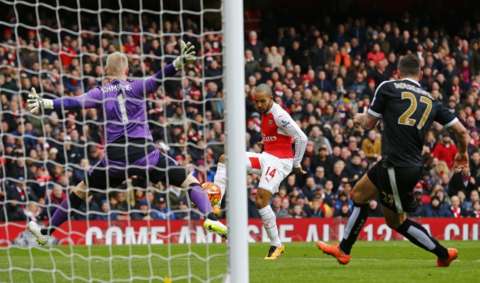A ball into the box found Olivier Giroud. He was well marshalled by two defenders but he deserves enormous credit for getting such a cute contact on the ball and his cushioned header found an onrushing Theo Walcott free. His volley passed Schmeichel at the near post and parity was restored.